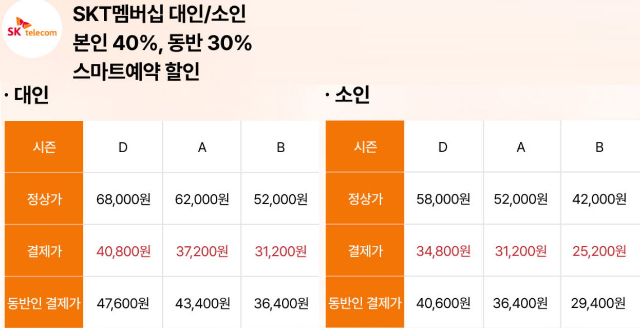 SKT 멤버십 | 대인/소인 본인 40%, 동반 30% 할인 |