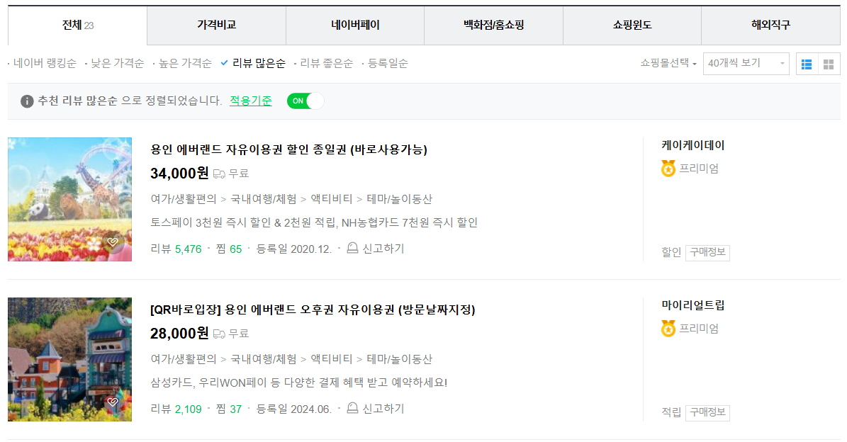 네이버 가격비교 기능을 활용하면 다양한 예매처의 에버랜드 자유이용권 가격을 한눈에 비교해 최저가로 구매할 수 있으며, 자유이용권과 큐패스를 함께 구성한 묶음 패키지를 선택하면 개별 구매보다 더 합리적으로 이용할 수 있습니다.