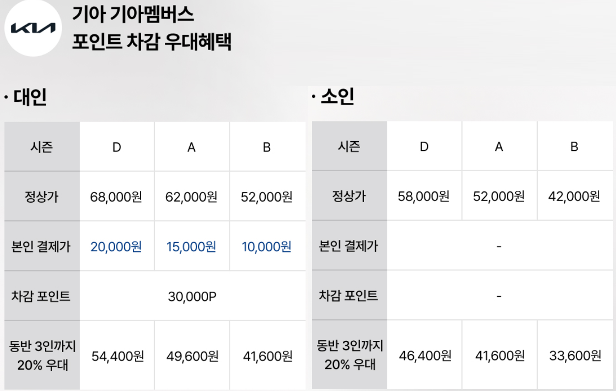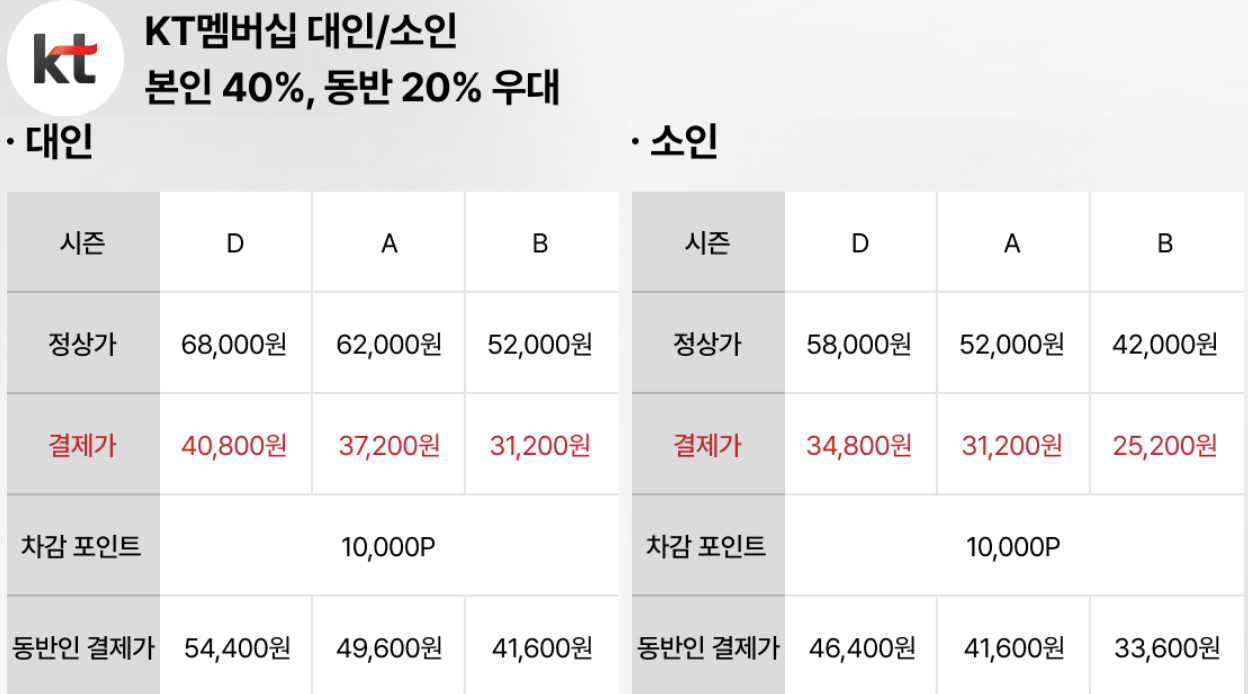 KT 멤버십 | 대인/소인 본인 40%, 동반 20% 할인 |